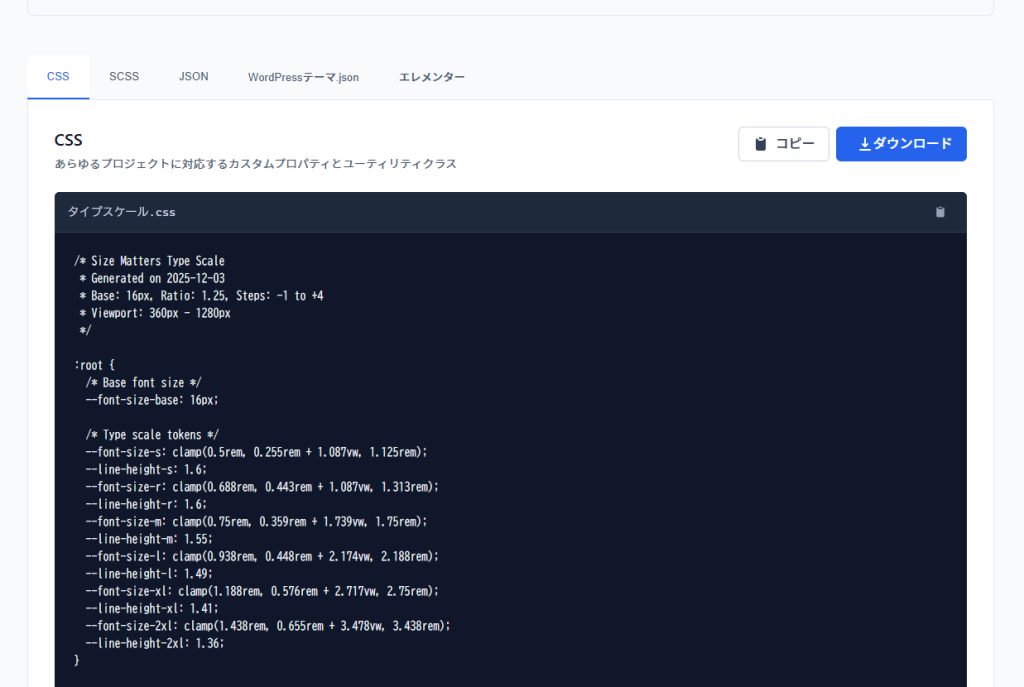 ↑画像はCSSの場合。コピペすればすぐに流体タイポグラフィを使えます。